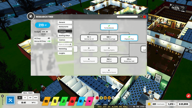 The research tree above is an excellent example of this intuitive interface design. It’s easy to tell which tech tree you’re in, which technologies are researched, what’s available to be researched, and what’s locked. With this type of design, you’ll spend less time wrestling with the interface, meaning you can spend more time on what’s essential: attracting guests and making money.